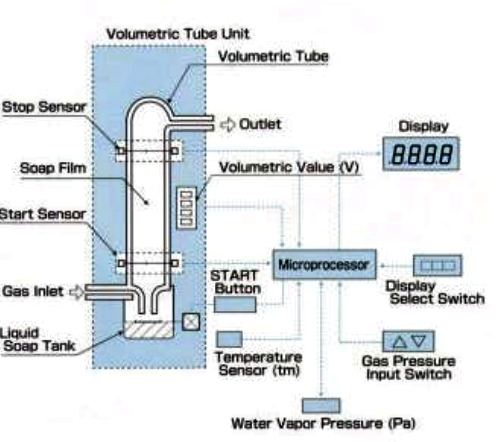 Lưu lượng được xác định bằng vận tốc hoặc tần số dịch chuyển của cảm biến thể tích khí, cùng với giá trị thời gian các giá trị đo từ cảm biến nhiệt độ, áp suất khí được tính toán và xử lý ngay lập tức bởi bộ vi xử lý để hiển thị lưu lượng dòng chảy khí có đơn vị (mL/min)tương ứng với điều kiện 20 °C và 760mm Hg.